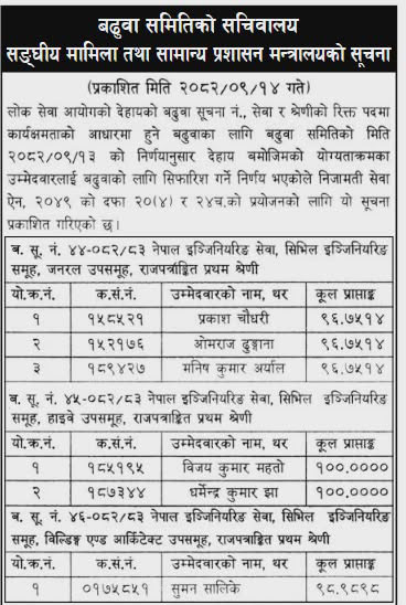 संघीय मामिला तथा सामान्य प्रशासन मन्त्रालयले एक सूचना प्रकाशित गर्दै रिक्त सहसचिव पदमा ज्येष्ठता र कार्यसम्पादन मूल्यांकनका आधारमा योग्य ठहरिएका उम्मेदवारहरूलाई बढुवाका लागि सिफारिस गरिएको हो।
