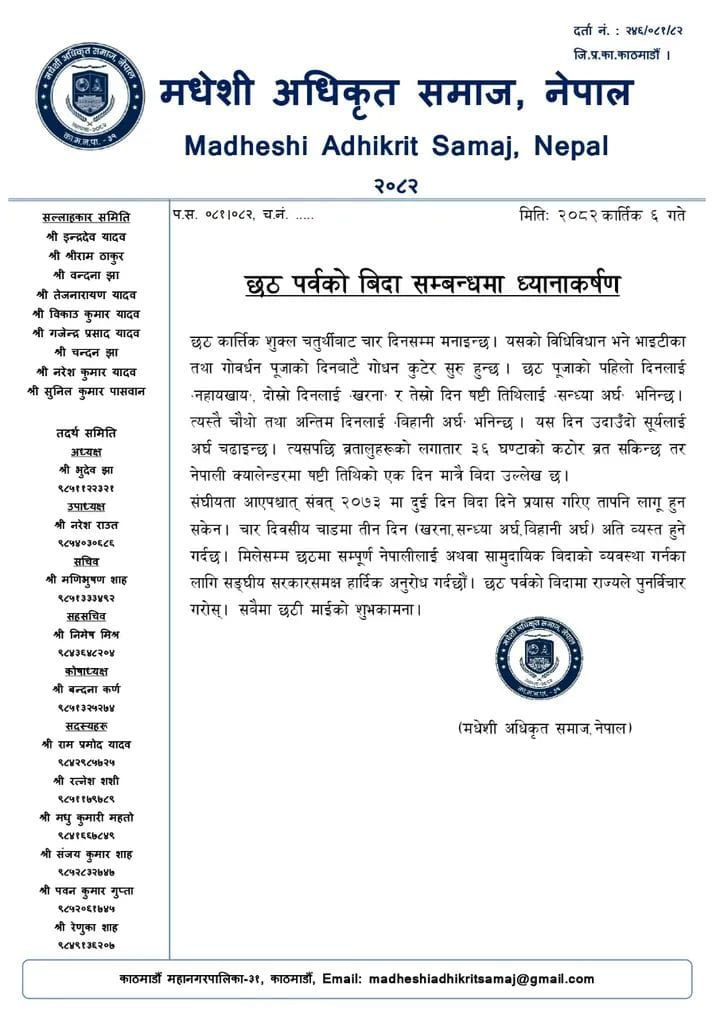 काठमाडौं । मधेशी अधिकृत समाज, नेपालले छठ पर्वको बिदा पुनर्विचार गर्न सरकारको ध्यानाकर्षण गराएको छ। ४ दिनसम्म मनाइने यस पर्वमा राज्यले हाल १ दिन मात्रै बिदा दिने प्रावधान राखेकामा समाजले असन्तुष्टि जनाउँदै पूर्ण वा कम्तीमा सामुदायिक बिदाको व्यवस्था गर्न माग गरेको छ।