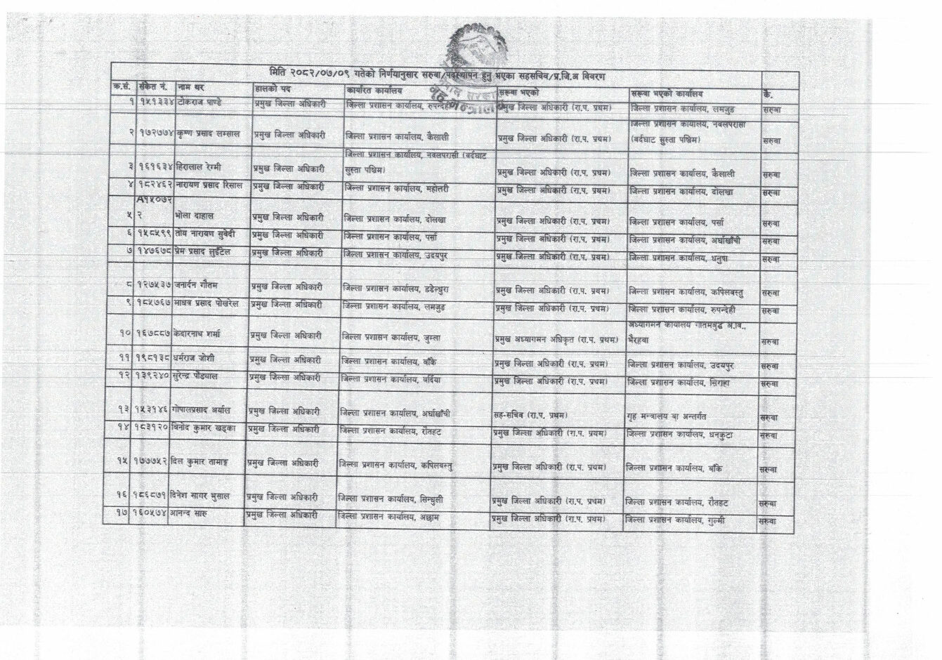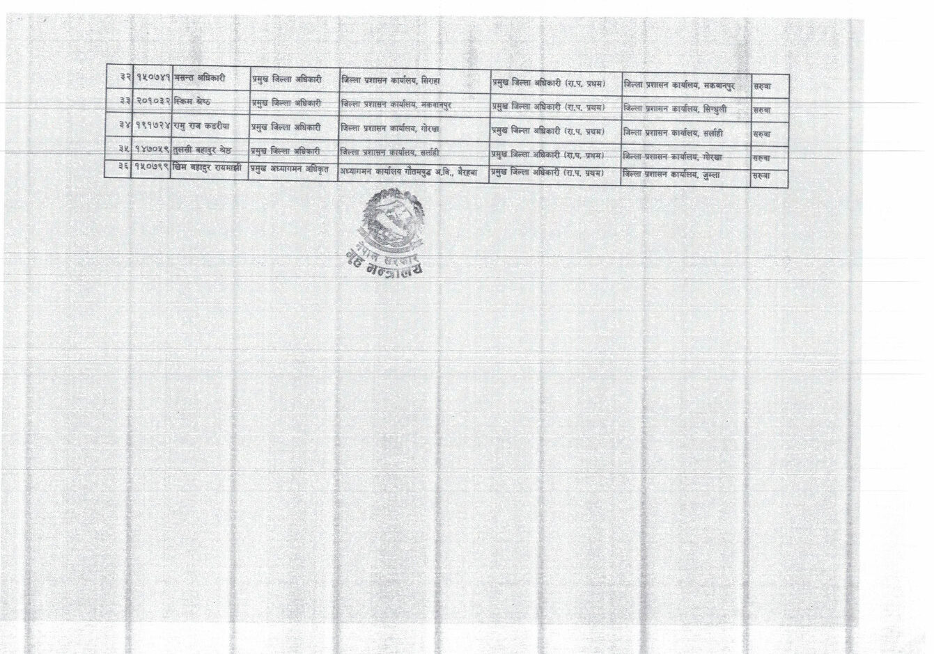 मन्त्रालयले आइतबार रुपन्देही, कैलाली, महोत्तरी, पर्सा, बाँके, बर्दिया, रौतहट, कपिलवस्तु लगायतका जिल्लाका प्रमुख जिल्ला अधिकारीहरूलाई नयाँ जिल्लामा सरुवा गरेको हो।