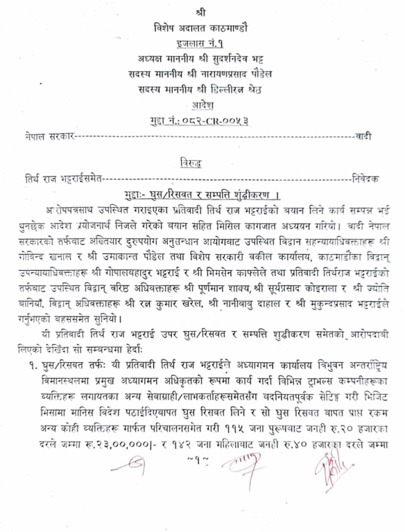 साथै भट्टराईविरुद्ध सम्पत्ति शुद्धीकरणको कसुरमा समेत मुद्दा दायर गरिएको थियो । मुद्दा दायरको भोलिपल्ट विशेषले भट्टराईविरुद्ध थुनछेक आदेश दिँदै २५ लाख रुपैयाँ धरौटी मागेको हो ।