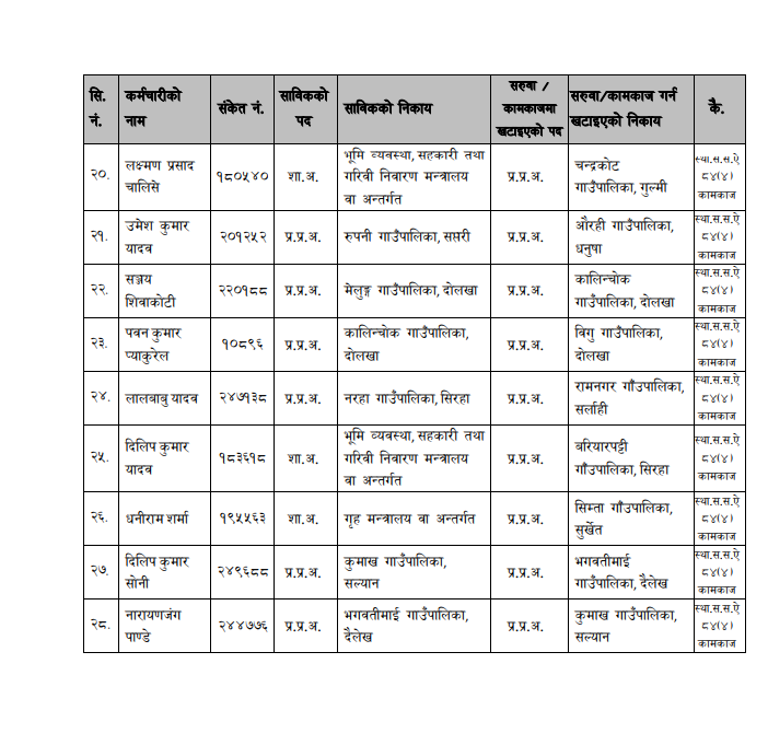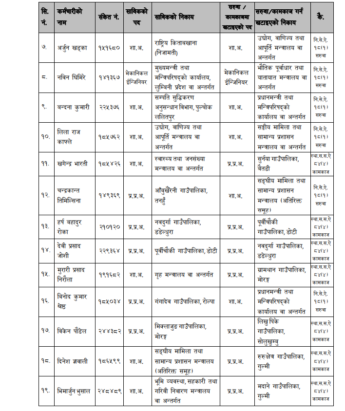 संघीय मामिला तथा सामान्य प्रशासन मन्त्रालयले पुष ४ र ६ गतेको निर्णय अनुसार विभिन्न पालिकामा कार्यरत ११ जना प्रमुख प्रशासकीय अधिकृतसहित र शाखाअधिकृस्तरका कर्मचारीहरूको सरुवा गरेको हो।