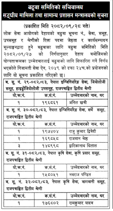 बढुवा समितिको आइतबार नेपाल इन्जिनियरिङ सेवा, जियोलोजी समूह, हाइड्रोजियोलोजी उपसमूह, राजपत्रांकित द्वितीय श्रेणी (उपसचिव) पदका लागि अनिल खत्री रहेका छन्। यस्तै, सर्भे समूह राजपत्रांकित द्वितीय श्रेणीअन्तर्गत राजु कुमार द्विवेदी, राजमान श्रेष्ठ र द्वारिकानाथ धिताल रहेका छन्।