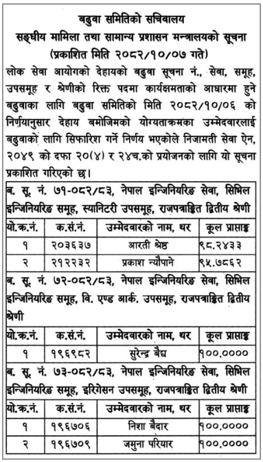 बढुवा समितिको मंगलबारको निर्णयअनुसार नेपाल इन्जिनियरिङ सेवा, सिभिल इन्जिनियरिङ समूह, स्यानिटरी उपसमूह (राजपत्रांकित द्वितीय श्रेणी) अन्तर्गत २ जना, नेपाल इन्जिनियरिङ सेवा, सिभिल इन्जिनियरिङ समूह, वि. एण्ड आर्क. उपसमूह, (राजपत्रांकित द्वितीय श्रेणी) अन्तर्गत १ जना र नेपाल इन्जिनियरिङ सेवा, सिभिल इन्जिनियरिङ समूह, इरिगेसन उपसमूह, (राजपत्रांकित द्वितीय श्रेणी) अन्तर्गत २ जना शाखा अधिकृतलाई उपसचिव पदमा बढुवा सिफारिस गरिएको हो ।