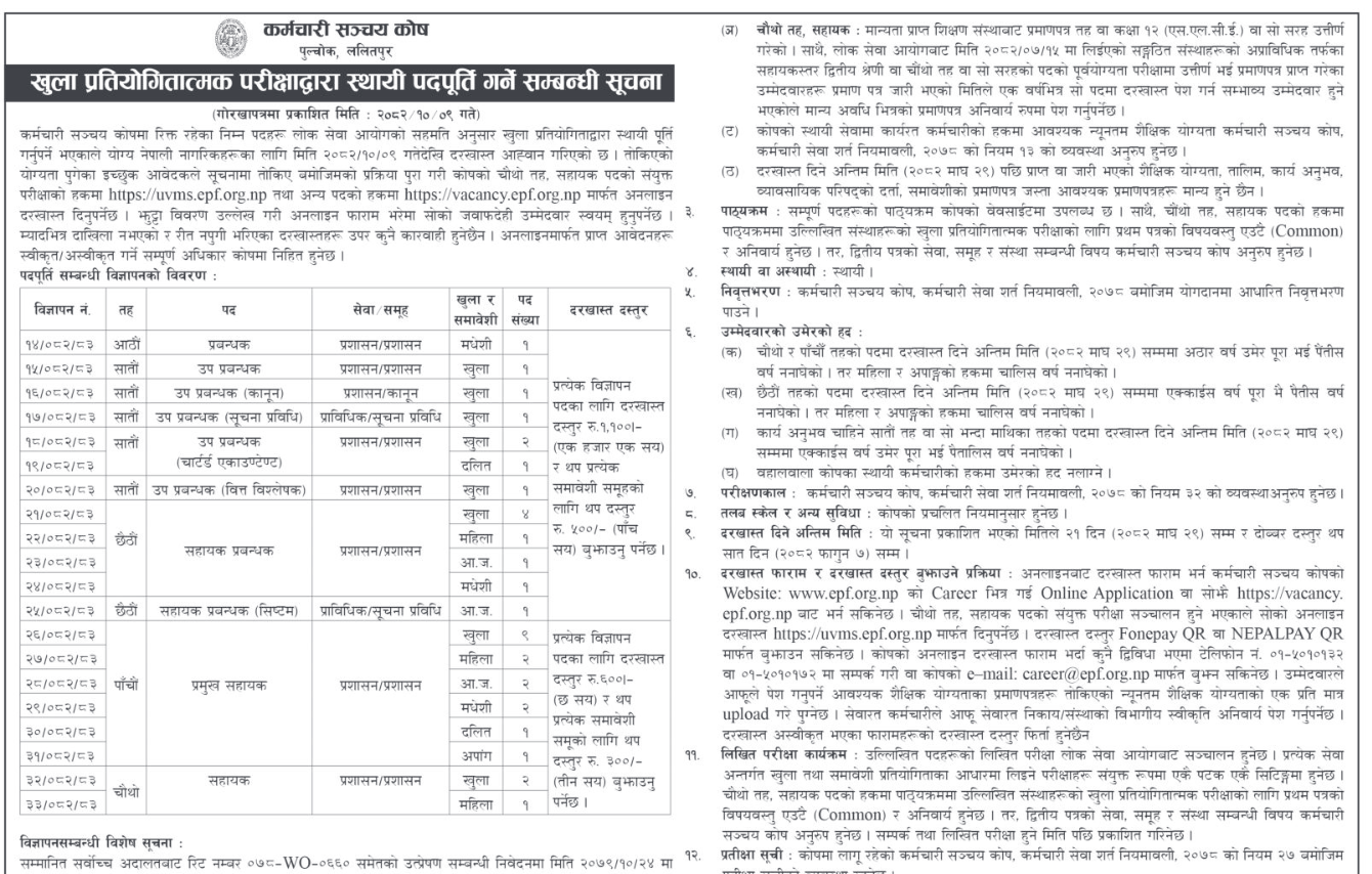 काठमाडौं। कर्मचारी सञ्चय कोषले विभिन्न पदमा ३६ जना कर्मचारी माग गरेको छ। कोषले माघ ९ गते आज एक सूचना जारी गर्दै खुला प्रतियोगितात्मक परीक्षाद्वारा पदपूर्ति गर्न चौथो तह (सहायक) देखि आठौँ तह (प्रवन्धक) सम्मका कर्मचारी माग गरेको हो।