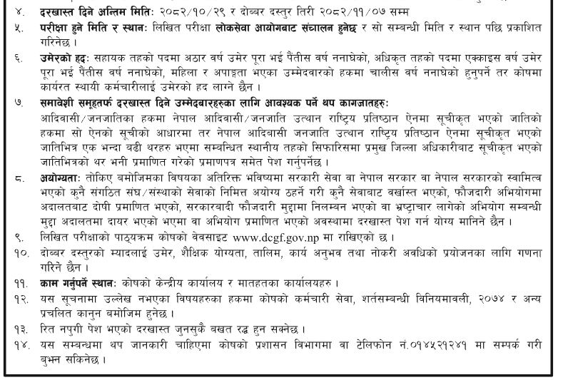 कोषले माघ ९ गते आज एक सूचना जारी गर्दै आन्तरिक प्रतियोगिता तथा खुला प्रतियोगिताद्वारा सातौँ तह अधिकृतदेखि छैटौँ तह सहायक अधिकृत पदका लागि कर्मचारी माग गरेको छ।