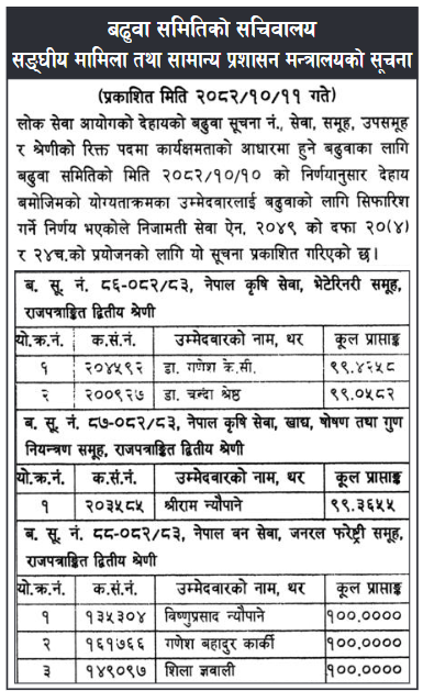 बढुवा समितिको शनिवारको निर्णयअनुसार नेपाल कृषि सेवा, भेटेरिनरी समूह, (राजपत्रांकित द्वितीय श्रेणी) अन्तर्गत २ जना, नेपाल कृषि सेवा, खाद्य, पोषण तथा गुण नियन्त्रक समूह, (राजपत्रांकित द्वितीय श्रेणी) अन्तर्गत १ जना र नेपाल वन सेवा, जनरल फरेष्ट्री समूह, (राजपत्रांकित द्वितीय श्रेणी) अन्तर्गत ३ जना शाखा अधिकृतलाई उपसचिव पदमा बढुवा सिफारिस गरिएको हो ।