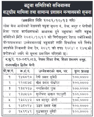 बढुवा समितिको सोमवारको निर्णयअनुसार नेपाल शिक्षा सेवा, शिक्षा प्रशासन समूह, (राजपत्रांकित द्वितीय श्रेणी) अन्तर्गत ७ जना शाखा अधिकृतलाई उपसचिव पदमा बढुवा सिफारिस गरिएको हो।
