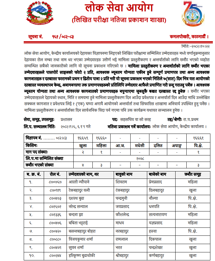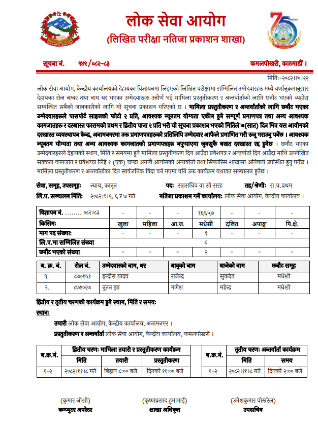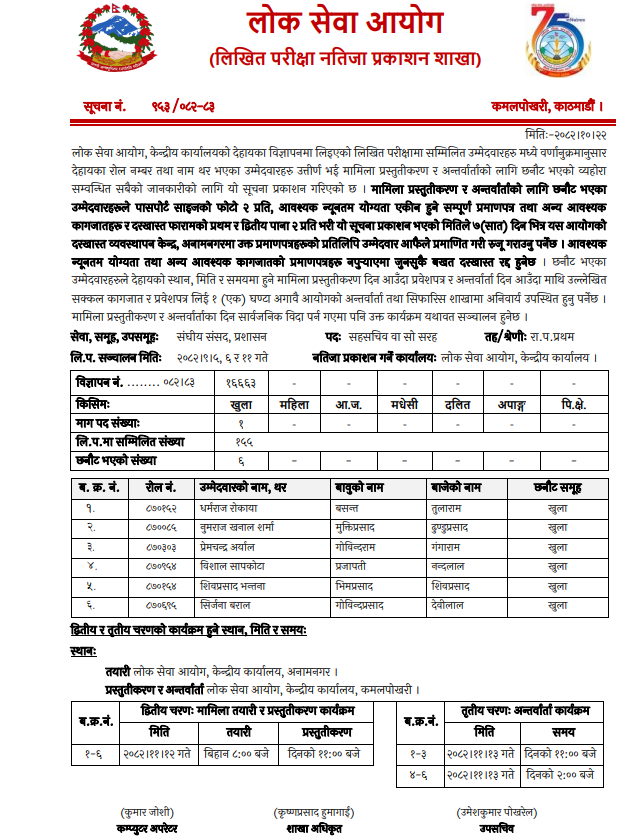 यस्तै लोक सेवा आयोग, केन्द्रीय कार्यालयको विज्ञापन नं. १६६६३/०८२–८३ (खुला), संघीय संसद् सेवा, प्रशासन समूह, रा.प.प्रथम श्रेणी, सहसचिव वा सो सरह पदको लिखित नतिजा पनि प्रकाशन गरिएको छ ।