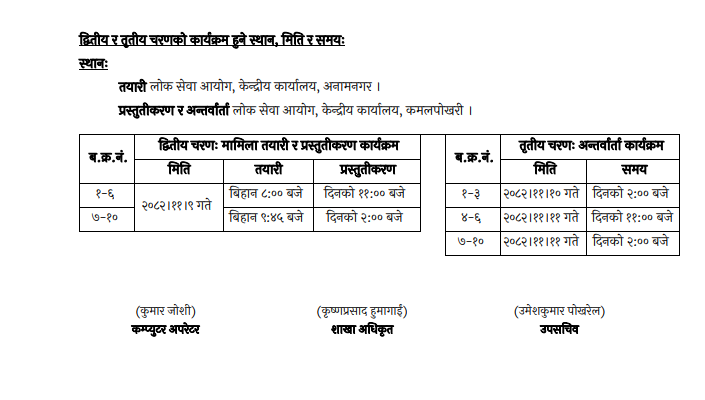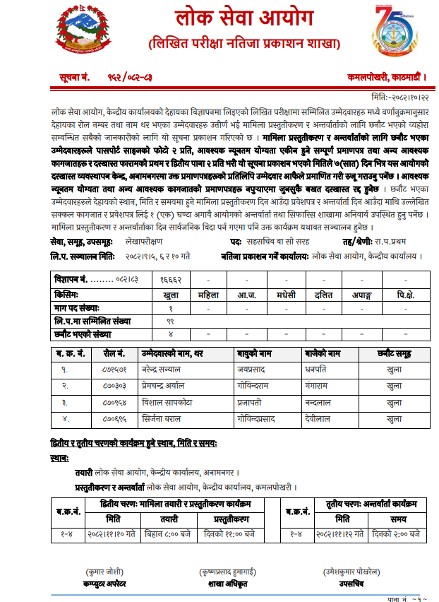 लोक सेवा आयोग, केन्द्रीय कार्यालयको विज्ञापन नं १६६५९–१६६६१/०८२–८३ (खुला तथा समावेशी), प्रशासन सेवा, विज्ञापन नं १६६५७/०८२–८३ (मधेशी), न्याय सेवा, कानुन समूह, रा.प. प्रथम श्रेणी, केन्द्रीय कार्यालयको विज्ञापन नं. १६६६२/०८२–८३ (खुला), लेखा परीक्षण सेवा, रा.प.प्रथम श्रेणी, सहसचिव वा सो सरह पदको लिखित नतिजा प्रकाशन गरेको छ।