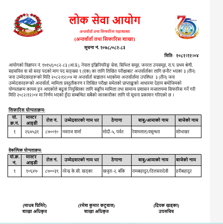 आयोगले चैत ४ गते लोक सेवा आयोग, केन्द्रीय कार्यालयको विज्ञापन नम्बर १७१५१÷०८२–८३ (आ.प्र.), नेपाल इन्जिनियरिङ सेवा, सिभिल समूह, जनरल उपसमूह, रा.प. प्रथम श्रेणी, सहसचिव वा सो सरह पदमा उम्मेदवार सिफारिस गरेको हो ।