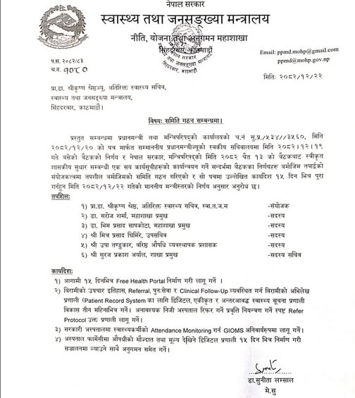 स्वास्थ्य तथा जनसङ्ख्या मन्त्रालयले अतिरिक्त स्वास्थ्य सचिव श्रेष्ठ को संयोजकत्वमा समिति गठन