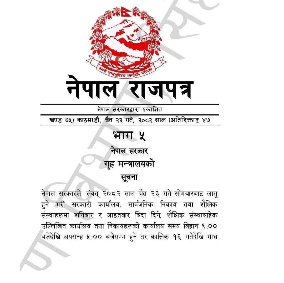 नेपाल राजपत्रमा प्रकाशित सूचनाअनुसार उक्त व्यवस्था २०८२ साल चैत २३ गते सोमबारदेखि लागू हुने गरी निर्णय गरिएको हो। सोअनुसार सरकारी कार्यालय, सार्वजनिक निकाय तथा शैक्षिक संस्थामा शनिबार र आइतबार बिदा दिइनेछ।
