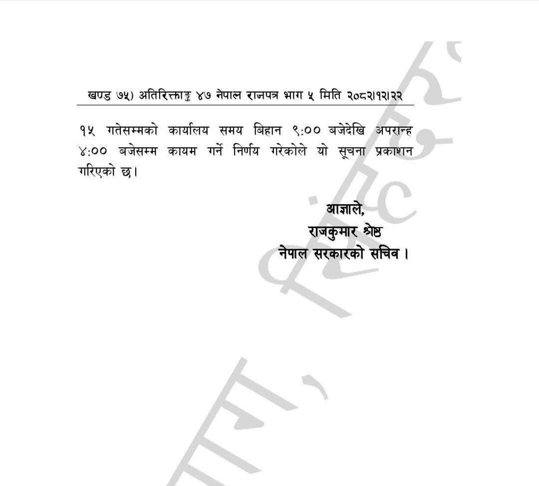तर कार्तिक १६ गतेदेखि माघ १५ गतेसम्मको कार्यालय समय बिहान ९ बजेदेखि अपराह्न ४ बजेसम्म कायम गर्ने निर्णय गरेकोसमेत जनाइएको छ ।