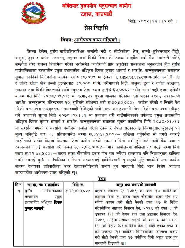 काठमाडौं। दैलेखको गुराँस गाउँपालिकाका तत्कालीन प्रमुख प्रशासकीय अधिकृत दीपक कुमार आचार्य सहित २ जना र आर.के. कन्स्ट्रक्सन विरुद्ध सार्वजनिक सम्पत्ति हानि नोक्सानी गरेको आरोपसहित भ्रष्टाचार मुद्दा दायर गरिएको छ।