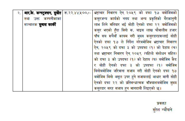 तत्कालीन प्रमुख प्रशासकीय अधिकृतसहित र कन्स्ट्रक्सनविरुद्ध भ्रष्टाचार मुद्दा दायर
