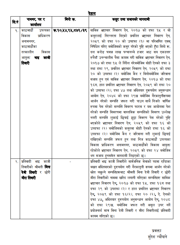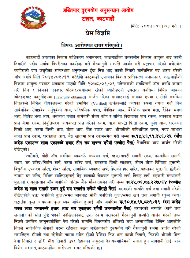 काठमाडौं। अख्तियार दुरुपयोग अनुसन्धान आयोगले काठमाडौँ उपत्यका विकास प्राधिकरणका पूर्व विकास आयुक्त भाइकाजी तिवारीविरुद्ध भ्रष्टाचार मुद्दा दायर गरेको छ।