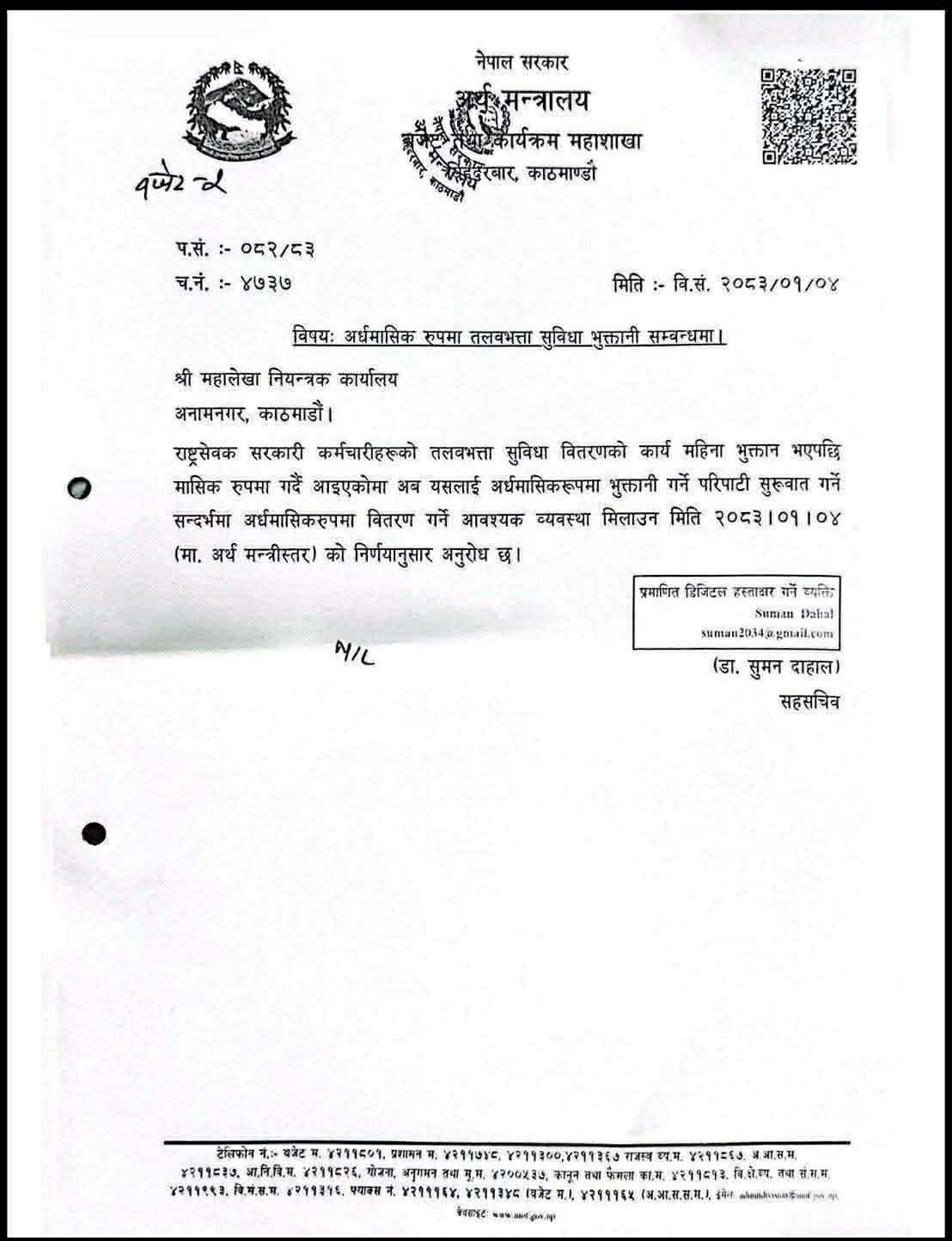मन्त्रालयअन्तर्गतको बजेट तथा कार्यक्रम महाशाखाबाट महालेखा नियन्त्रक कार्यालयलाई प्रेषित पत्रअनुसार हालसम्म मासिक रूपमा वितरण हुँदै आएको तलब भत्ता अब अर्धमासिक (१५/ १५ दिनमा) रूपमा भुक्तानी गर्ने व्यवस्था मिलाउन निर्देशन दिइएको हो।