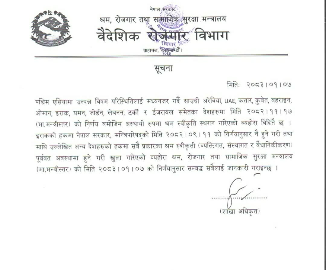 श्रम, रोजगार तथा सामाजिक सुरक्षा मन्त्रालयको हालैको मन्त्रीस्तरीय निर्णयअनुसार इराक बाहेकका सबै उल्लेखित देशहरूमा व्यक्तिगत, संस्थागत तथा वैधानिकीकरणसम्बन्धी सबै प्रकारका श्रम स्वीकृति प्रक्रिया पूर्ववत रूपमा सञ्चालनमा ल्याइएको विभागले स्पष्ट पारेको छ।