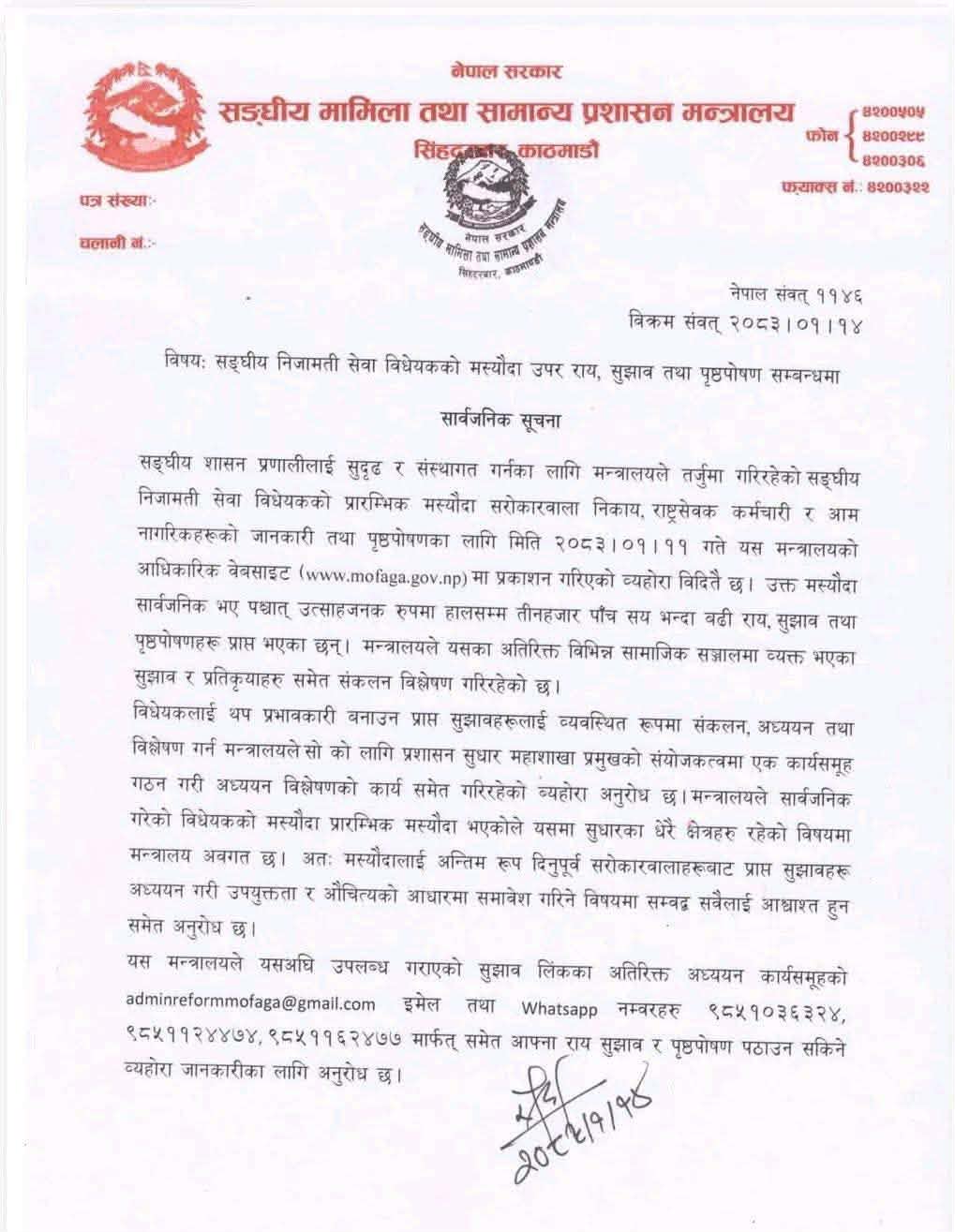 संघीय निजामती सेवा विधेयकको मस्यौदामा सुझाव दिन आह्वान